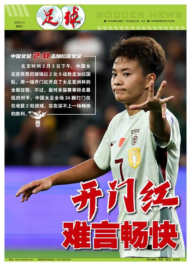 记者王伟报道 北京时间3月3日下午,中国女足在西悉尼球场以2比0战胜孟加拉国队,用一场开门红开启了女足亚洲杯的全新征程。不过,面对本届赛事排名最低的对手,中国女足全场24脚打门仅仅收获2粒进球,实在谈不上一场畅快的胜利。